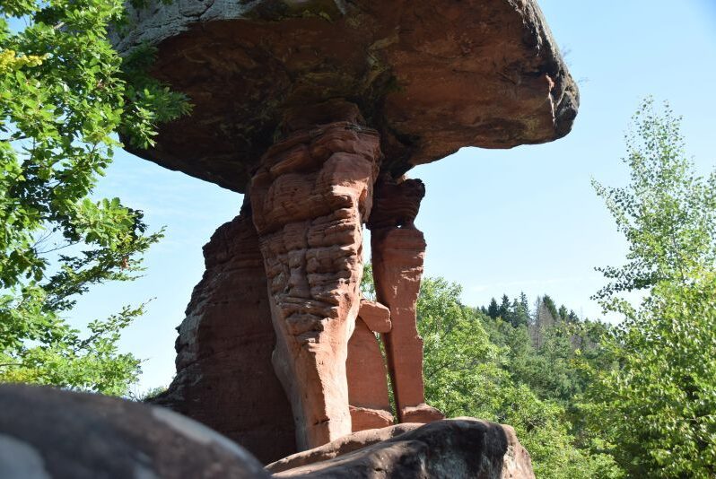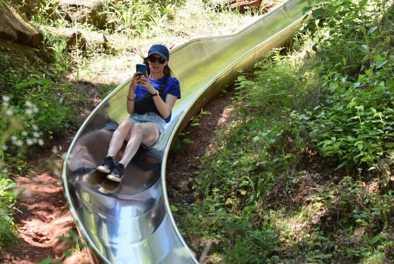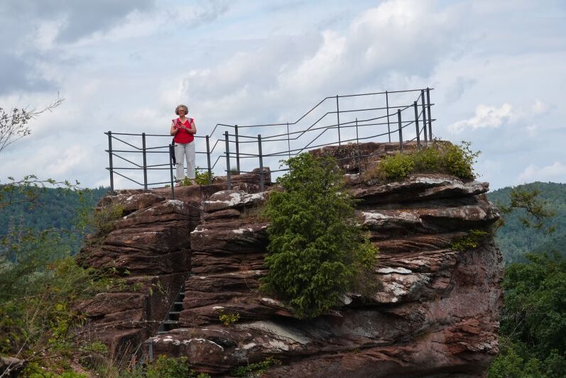 Und als letztes: die Wanderungen, ja, Mehrzahl – das Dahner Felsenland ist ein echtes Wanderland und so haben wir uns zweimal zum Wandern durchgerungen, beide Wege voll mit roten Felssäulen, roten Burgen, Teufelstischen – manchmal verläuft man sich und geht den steilsten Weg den man finden kann – oder man stürzt direkt am Anfang der Wanderung, und läuft alles mit dickem Fuss weiter – auch längere Metallrutschen am Ende einer Tour können zum echten (Verbrennungs-)Problem werden.