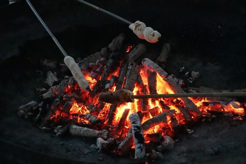 Der Lagerfeuer-/Stockbrotabend: Man nehme den Stockbrotteig, mache entweder Käsestückchen oder Schokodrops rein und halte das ganze liebevoll über das Feuer… leeecker!
